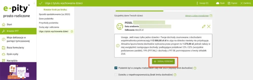 Додаємо особисту інформацію про дітей: PESEL, ім’я та прізвище, дату народження. Вибираємо період, за який ця пільга належить. Якщо ви працювали весь рік – встановлюємо галочку в поле “цілий рік”, якщо працювали кілька місяців – вказуєте відповідні місяці.