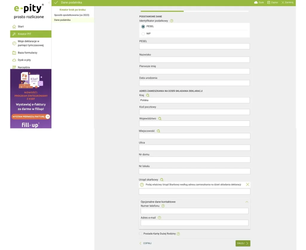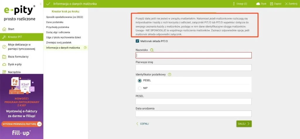 E-pity Скріншот з сайту E-pity.pl Наступна сторінка – інформація про супругу. Якщо ви з супругом або супругою сплачуєте податок окремо, додатки PIT/O або PIT/D повинні бути заповнені та додані до декларації кожним із супругів.