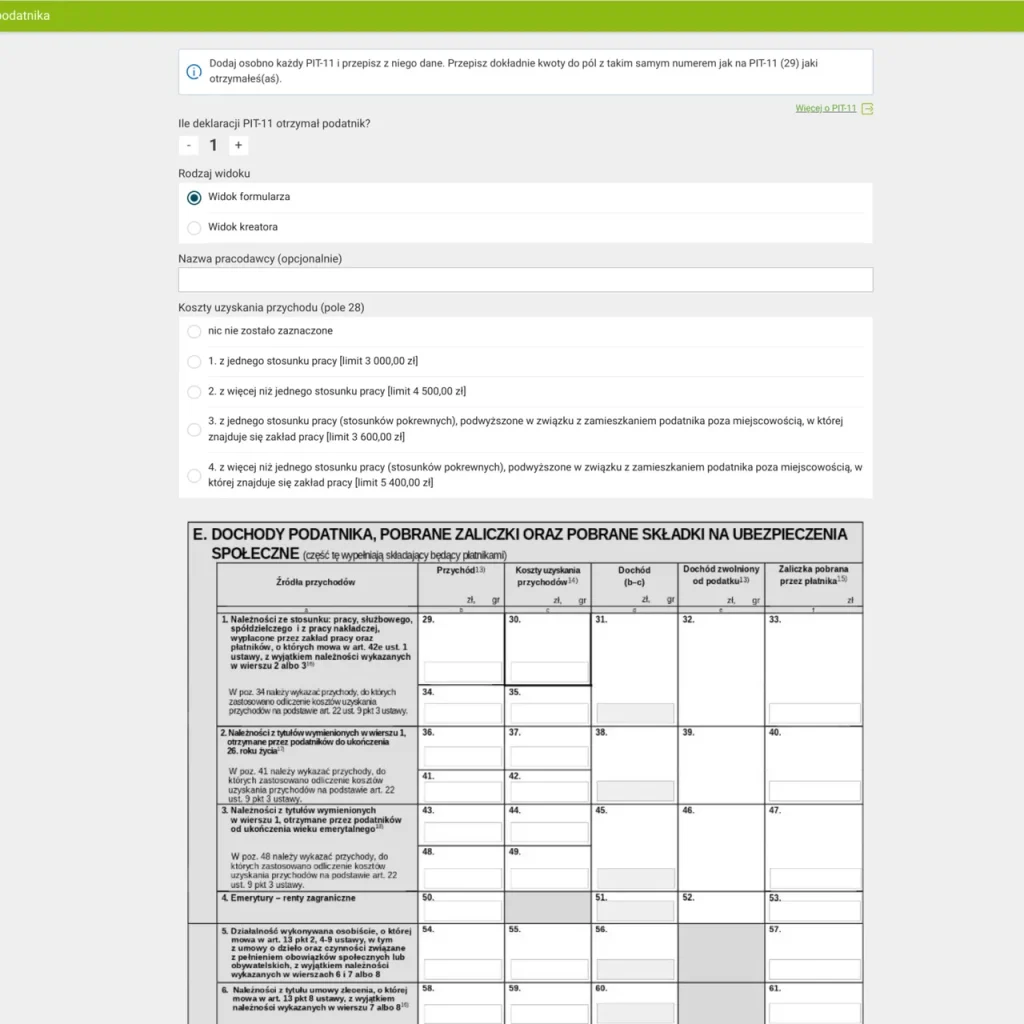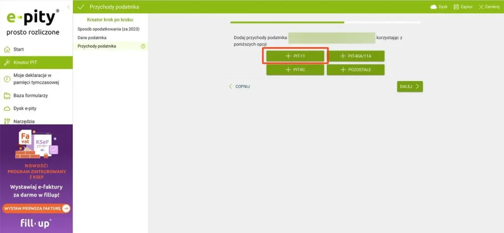 Після заповнення всіх необхідних даних потрібно вибрати джерело інформації про доходи. У нашому випадку це PIT-11.